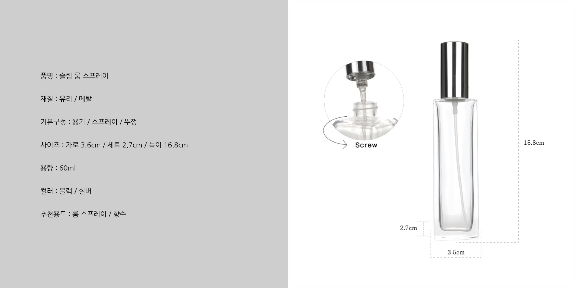 - 향수병에 비해 분무량이 많으며, 돌려서 여닫는 스크류 타입으로 리필이 용이합니다.