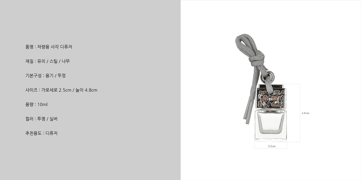 - 뚜껑 내부의 원목에 디퓨저 용액이 젖어들며 발향되는 원리로 차량 내부에 매달아 사용할 수 있습니다.