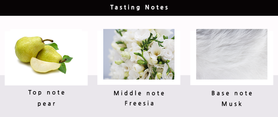 프리지아에 이제 막 익은 배의 신선함과 새콤함을 입히고 앰버, 화이트 머스크로 가볍지 않은 은은함을 더한 향입니다.