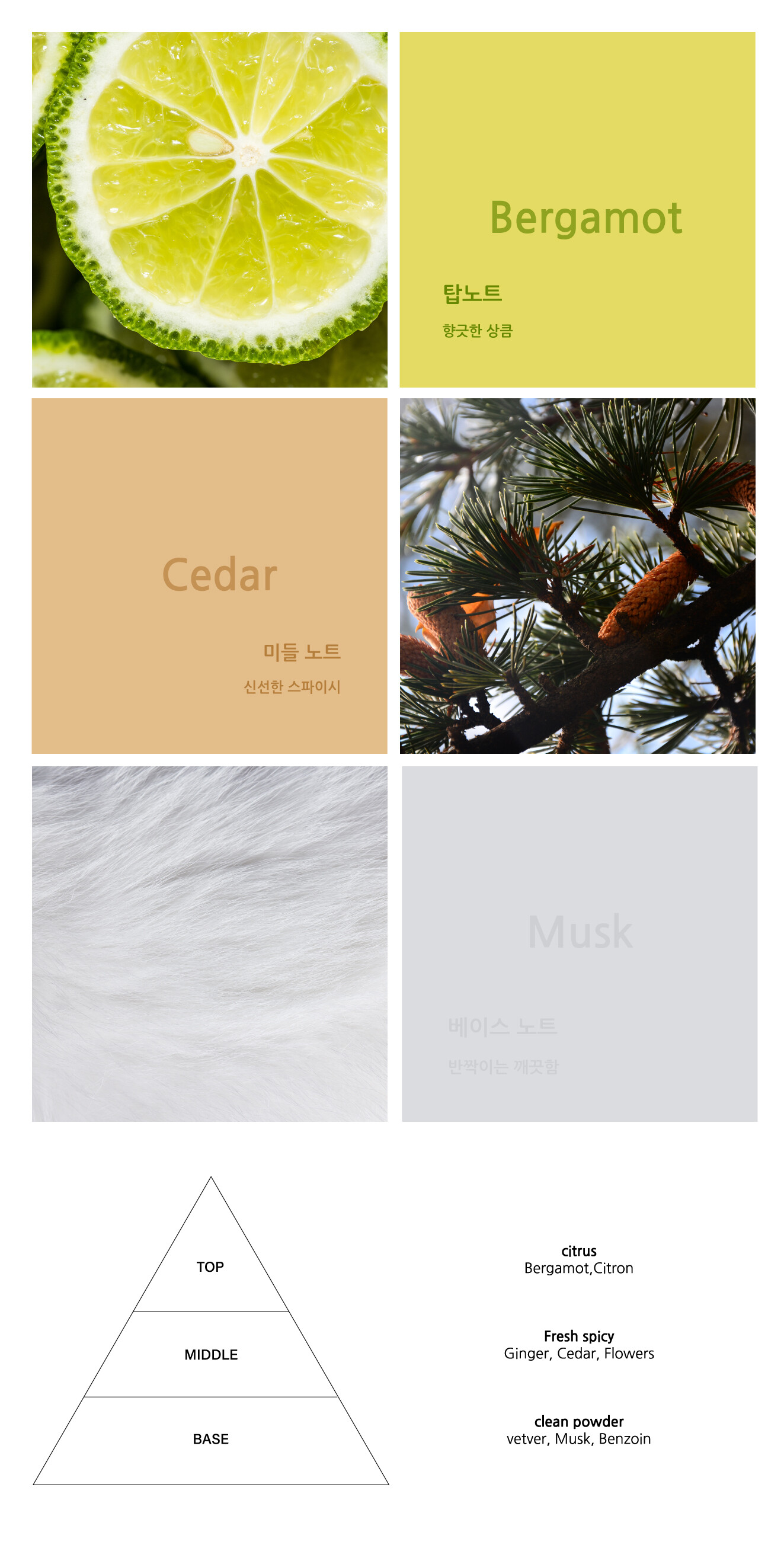 Sparkling Bergamot note는 Cedarwood, Red Ginger, Vetiver note와 함께 즐거운 느낌을 선사합니다.