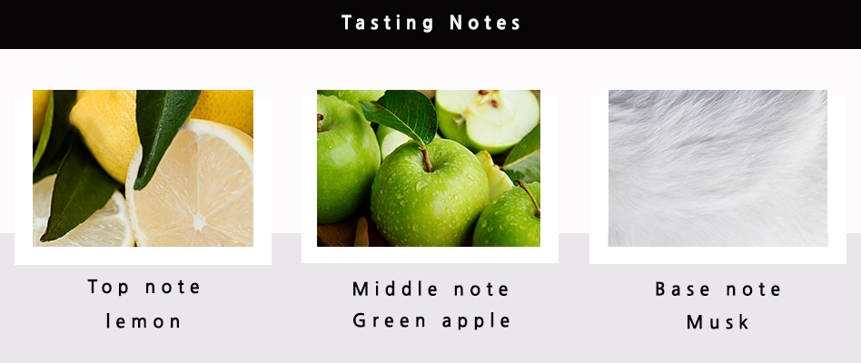 Apple, Cedar, Bellflower, Sicilian Lemon, White Rose, Bamboo, Jasmine, Amber, Musk, Cedar.