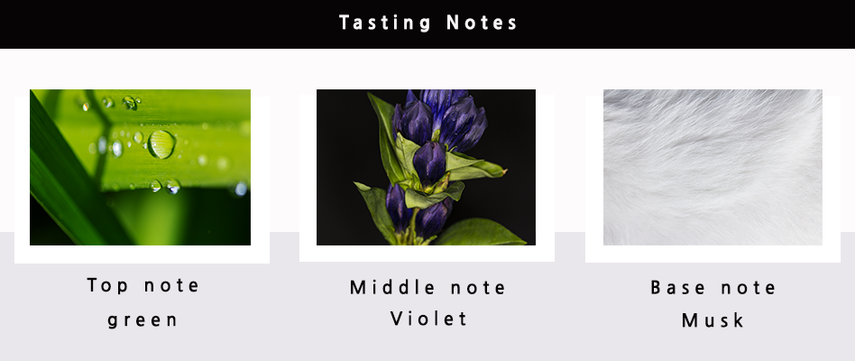 바이올렛, 바닐라의 가장자리에 밝고 부드러운 머스크. 섬세한 향기가 사랑스러운 기억으로 아늑하고 편안하게 느껴집니다.