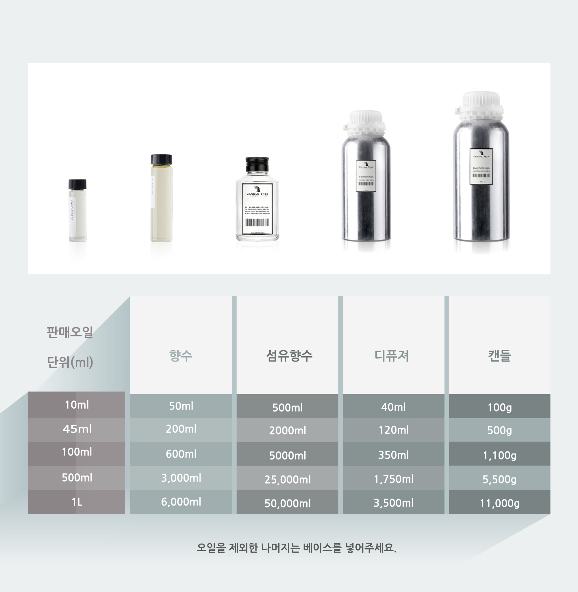 본 안전테스트는 프래그런스 오일 자체의 피부접촉 안전성검증을 위한 것이며, 각 응용품과 성상 및 특정 레시피에 따른 혼합성 테스트 결과는 아닙니다.