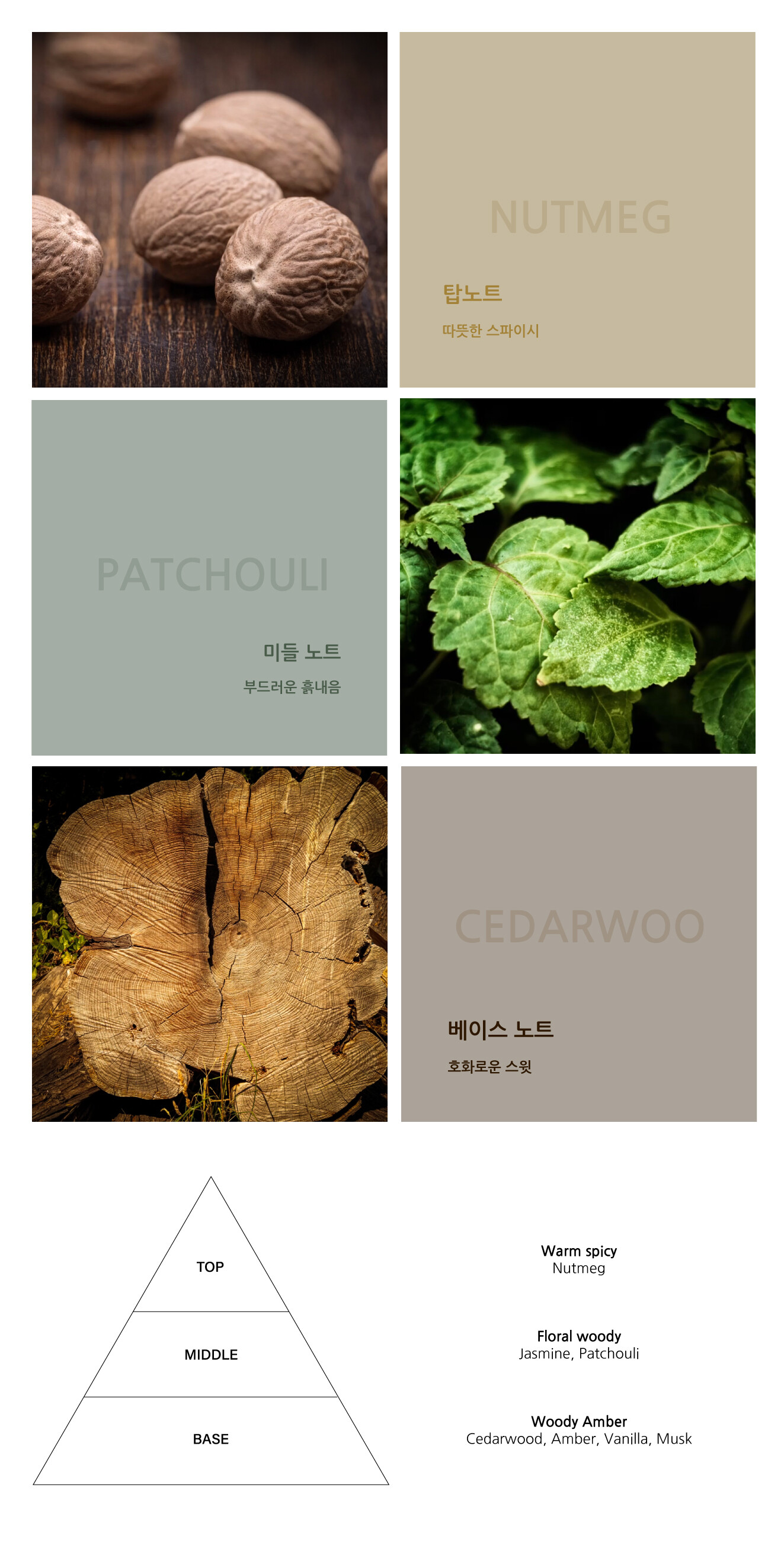 짙고 깊은 향의 Woody note 와 Spicy note 가 어우러진 오묘하고 강렬한 느낌의 Fragrance 입니다. Top note 의 N utmeg 은 독특한 Warm spicy note 로 약간의 Freshness를 주며 향의 시작을 알립니다. Middle note 의 부드러운