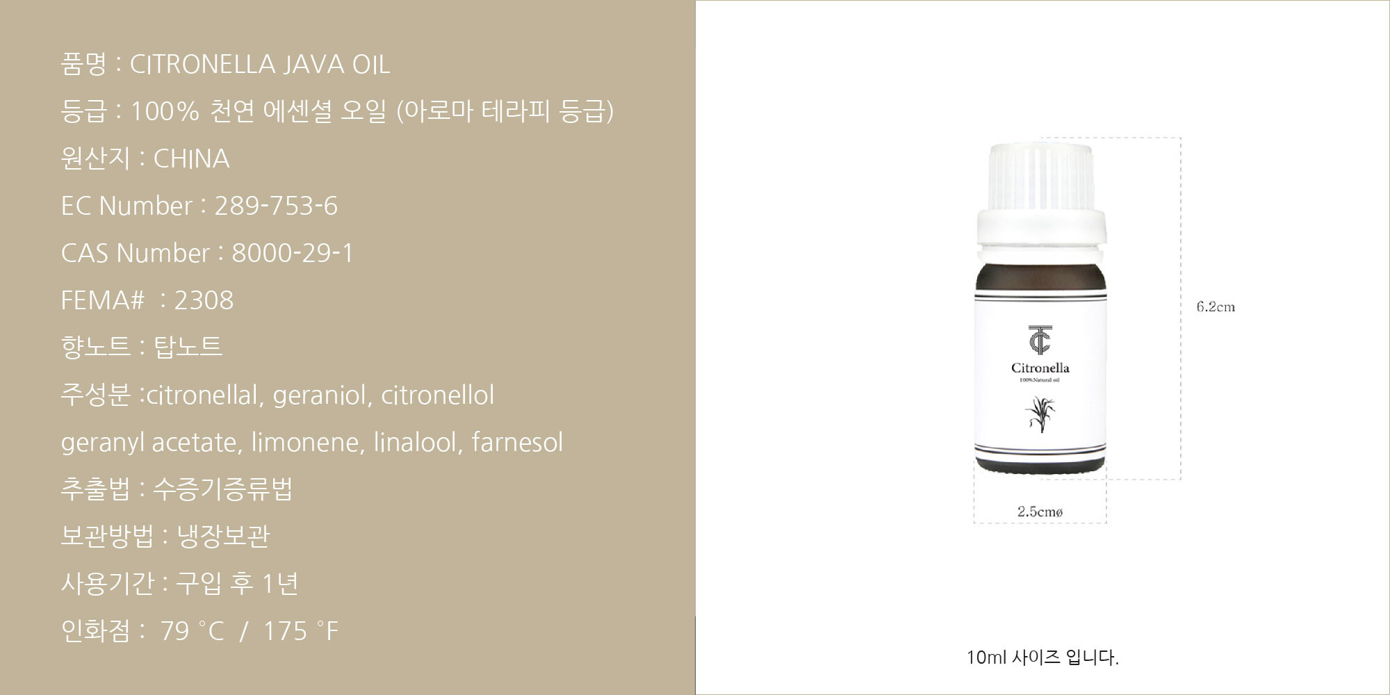 레몬과 비슷한 풍부하고 신선하고 상쾌한 향기를 풍기는 이 향긋한 풀은 프랑스어로 '레몬밤'을 의미하는 시트로넬라 라는 이름을 얻었습니다. 시트로넬라는 레몬그라스와 외관 및 성장, 가공방법이 유사하여 흔하게 오인되기도 하는데, 'Lynongrass'라고 불리는 Cymbopogon과 같은 식물 군에 속하기 때문에 둘은 '사촌'으로 간주됩니다. 이 둘을 구별하는 가장 쉬운 방법은 색상입니다. 시트로넬라 Citronella 의 색상이 적색인 반면, 레몬그라스 Lemongrass 는 회백색을 갖고있습니다. 수 세기동안 시트로넬라 오일은 중구 스리랑카 및 인도네시아의 자연적인 의약 치료법과 식품 성분으로 사용되었습니다. 그것은 전통적으로 통증, 감염, 발진 및 염증을 완화하기 위한 요리의 향료제로 사용되었으며, 무독성 방충제의 역할로 자연스럽고 향기로운 가정용 세정제나 향수, 비수, 세제, 향초, 화장품의 성분으로 사용되었습니다. 시트로넬라 오일은 지속적으로 가치를 인정받고 있으며, 클렌징, 소독, 탈취등의 특성으로 이용되고 있습니다.