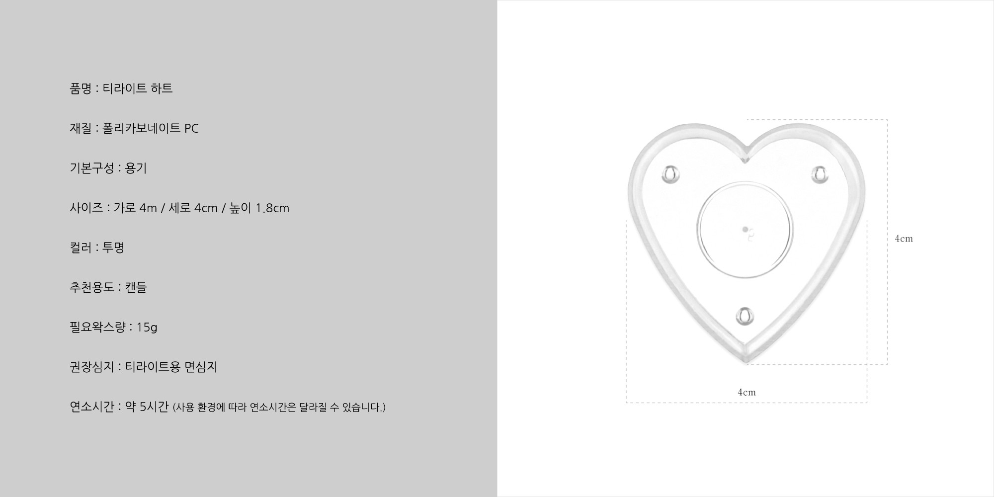 - 고온에 강한 PC 재질의 티라이트용 컨테이너이나 불꽃이 직접 용기에 닿을 경우 용기가 녹을 수 있으므로 전용 심지를 사용해 주세요.