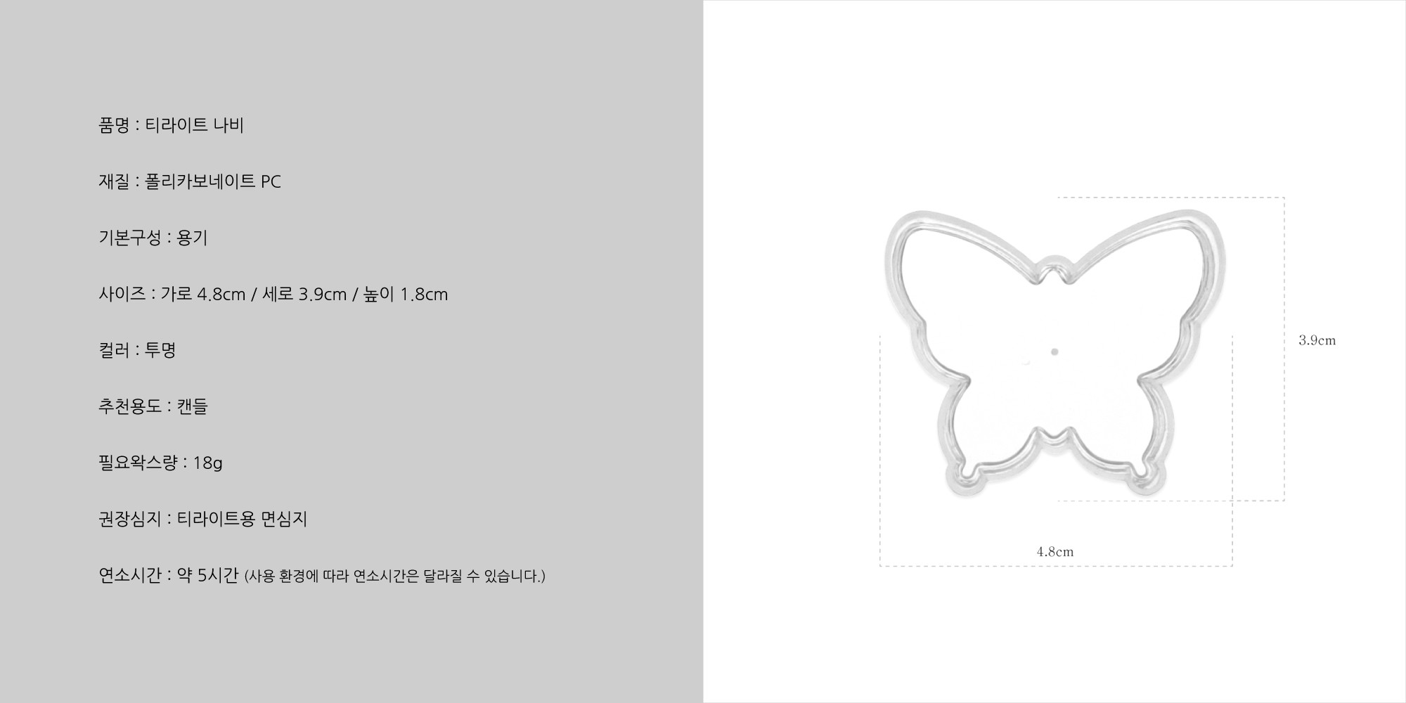 • 고온에 강한 PC 재질의 티라이트용 컨테이너이나 불꽃이 직접 용기에 닿을 경우 용기가 녹을 수 있으므로 전용 심지를 사용해 주세요.