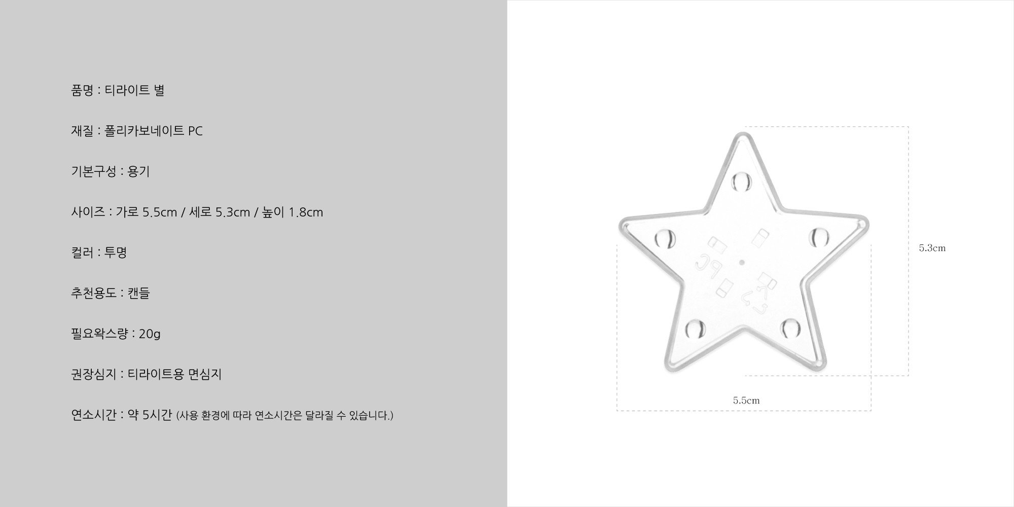 • 고온에 강한 PC 재질의 티라이트용 컨테이너이나 불꽃이 직접 용기에 닿을 경우 용기가 녹을 수 있으므로 전용 심지를 사용해 주세요.