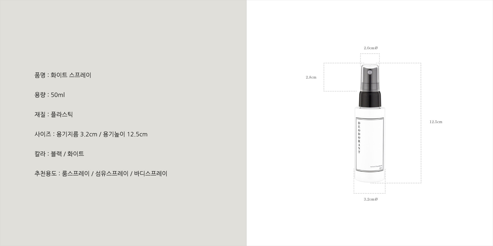 • 모던하고 심플한 디자인으로 남녀노소 휴대하며 사용하기 좋은 사이즈의 스프레이 용기입니다.