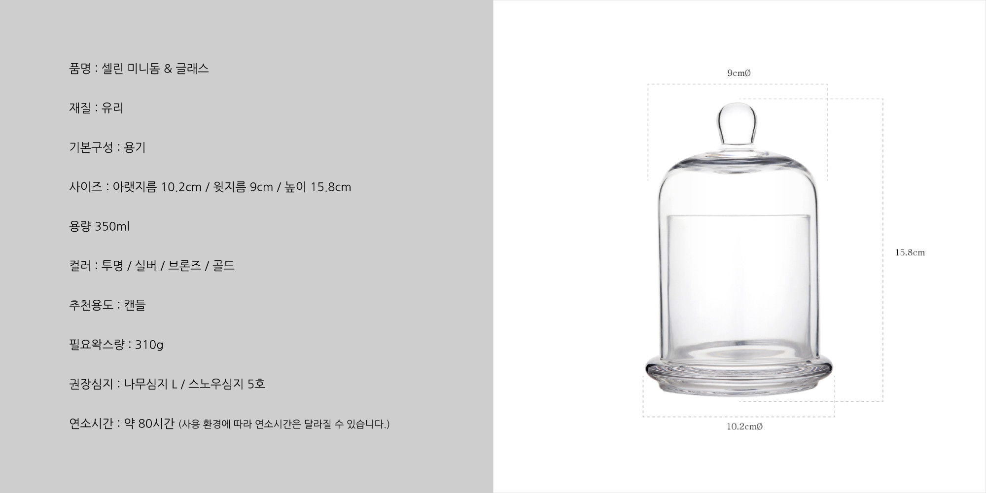 • 투명, 실버, 브론즈, 골드 4가지 색상의 고급스러운 용기와 유리 돔까지 한 세트 구성으로 인테리어 소품으로도 손색이 없습니다.